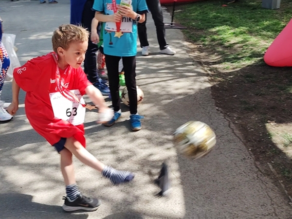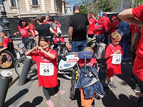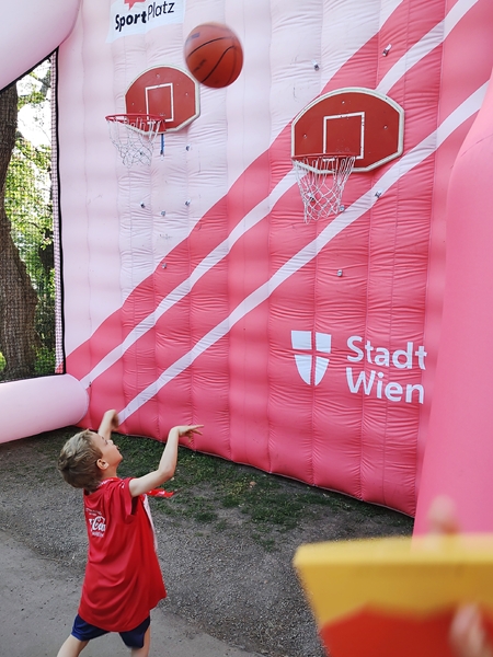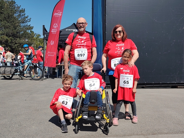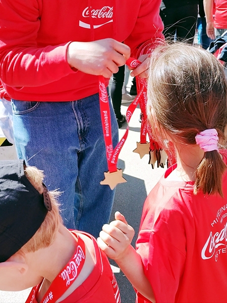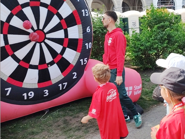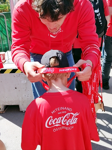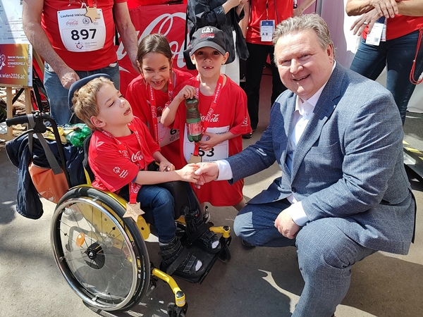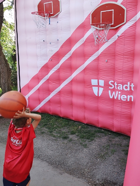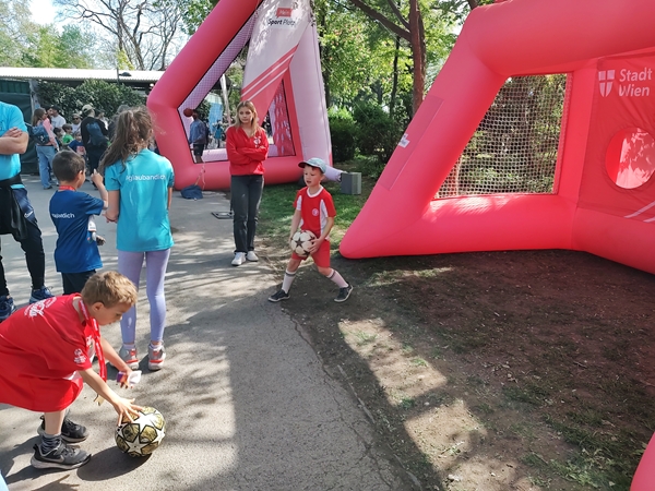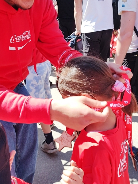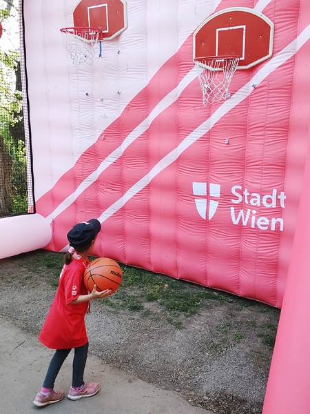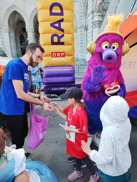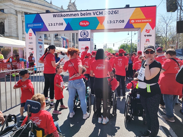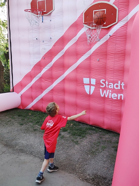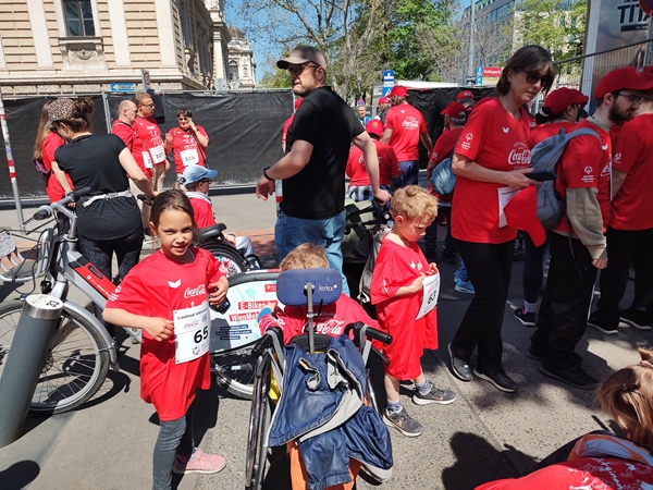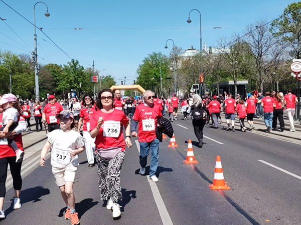 Just after 1 pm the line finally started moving. They let us in to go all the way to the starting line. There we could hear the MC who was interviewing a few people including the mayor of Vienna. At exactly 1:30 pm the race started - the inclusion run with 1000 people with handicaps and their relatives and friends. It's the weekend of the Vienna City Marathan that 49.000 people registered for to run tomorrow. However, there was no time-taking for the people in the inclusion run. Some could run, some could only walk. Everyone went at their speed possible to them. We pushed Sammy, while Tammy and Emmy sometimes ran ahead a little. We walked to the parlament then turned around and walked back on the other side and then through the goal. The mayor was standing at the goal and smiling at everyone, as well as some other famous people. One of those guys, a sports guy from TV (Philipp), came up to Sammy and gave him a hi-five. It was really sweet. We kept walking, following the crowd, until we got to the entrance of "the village" that was set up on Town Hall square. There some guys were distributing the medals to all the participants. It was wooden and not very good-looking.