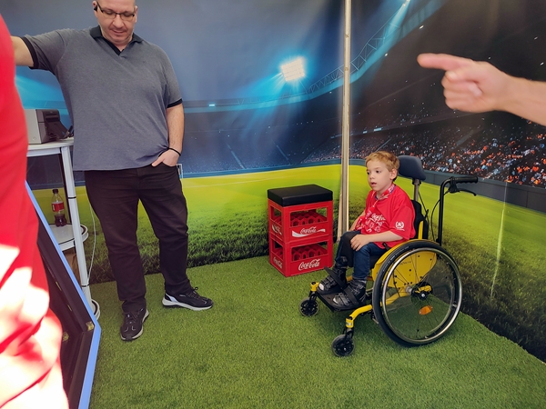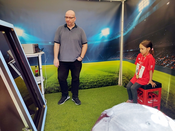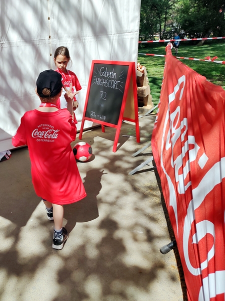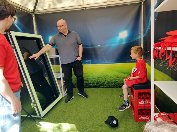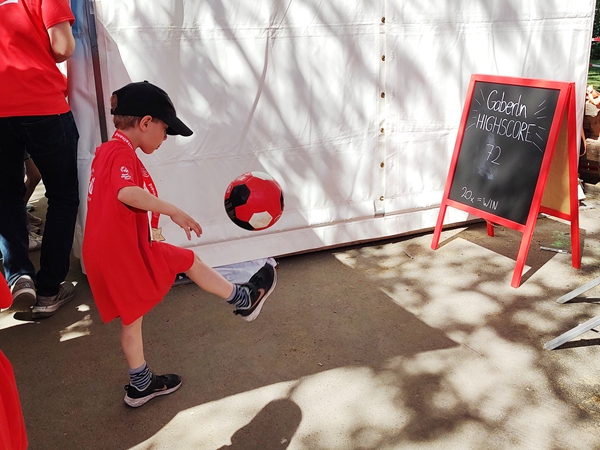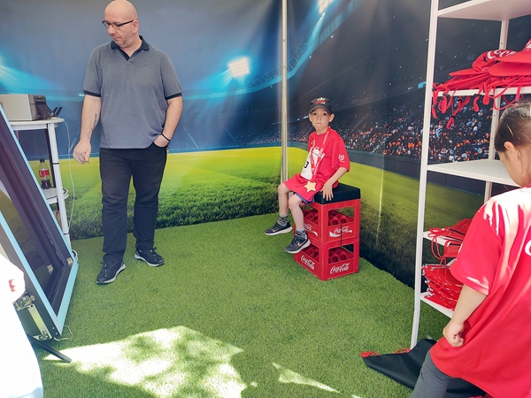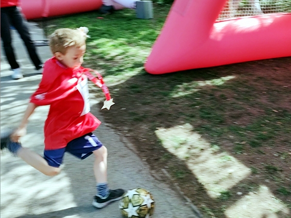 We continued walking. There were people everywhere and there were different booths set up. They were handing out free water, apples, bananas and bars, and you could also buy food. There was also a booth where you could have a picture of yourself with the national soccer team taken. The kids stood in line for that but it wasn't really worth it. They replaced the goalie's face with the kid's face but it looked like they'd been aged to match, and it looked nothing like them at all. Right next to that, there was a station where you had to keep a soccer ball in the air kicking it at least 20 times. Emmy tried several times but his highest score was 19, he said.