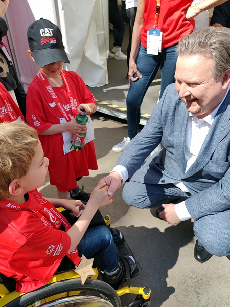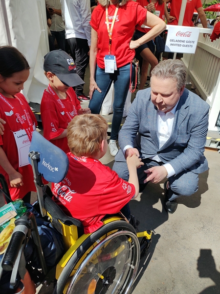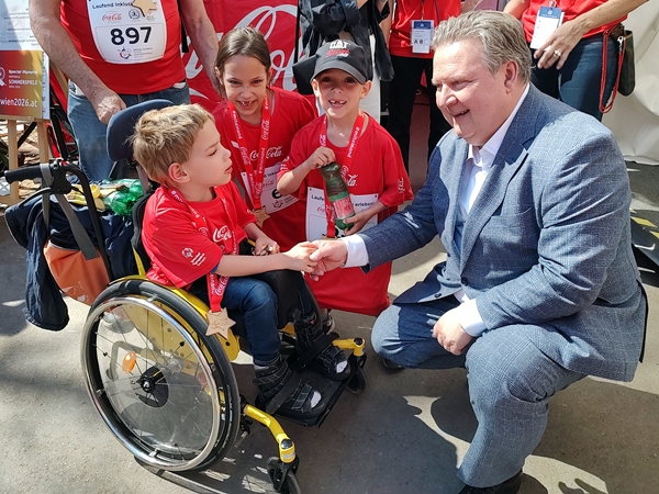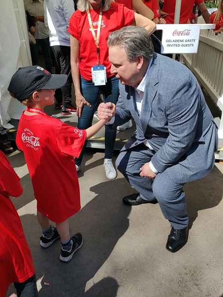 After we got the free water, fruit and bars, we continued walking and saw the mayor of Vienna. He turned to us, smiled and shook the kids' hands. Then he squatted down to say hello to Sammy. I asked him whether I could take a picture, and it turned out quite nice.