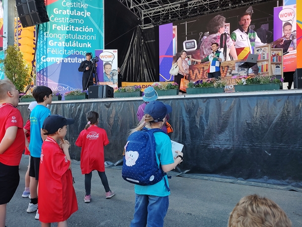 We continued walking and walked all the way up to the stage. They had a kids' program going on up there that was broadcast live on radio; it was a famous guy with his puppet rat. He was doing games so the kids ran up to the stage and put their hands up to be chose. They tried again and again but were never chosen, much to their disappointment. We stayed until the program was over at 3 pm. Emmy then walked over to the Song Contest mascot where they had gifts and lollipops they were handing out. Tammy followed him but Sammy was too scared to go near the mascot.
