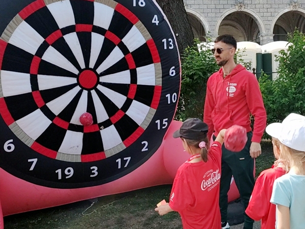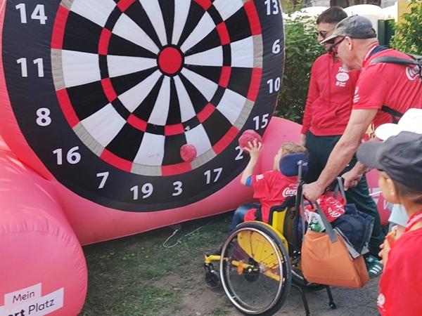 We decided it was time to go home but that turned out to not be so easy. We could not go back the way we came so we turned around and walked through the park to go around where it was closed off. On the way we discovered more stations that the kids wanted to check out. There was a darts station, soccer and basketball. The kids did all three and had fun but there were no prizes to win.