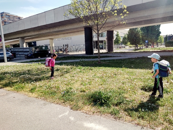 At 1:50 pm they came out of school, and we walked to the bus stop right away, going the opposite direction from home. We then got on the subway and walked to another bus that we rode to the school where Emmy has his soccer class every Tuesday at 2:30 pm. I walked him to the locker room where some kids were still getting changed even though the class had already started. Emmy then went into the gym, and Tammy and I left. She left her schoolbag there so she didn't have to carry it.
