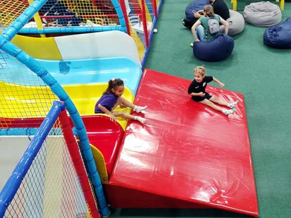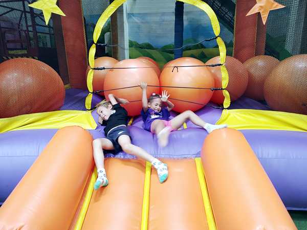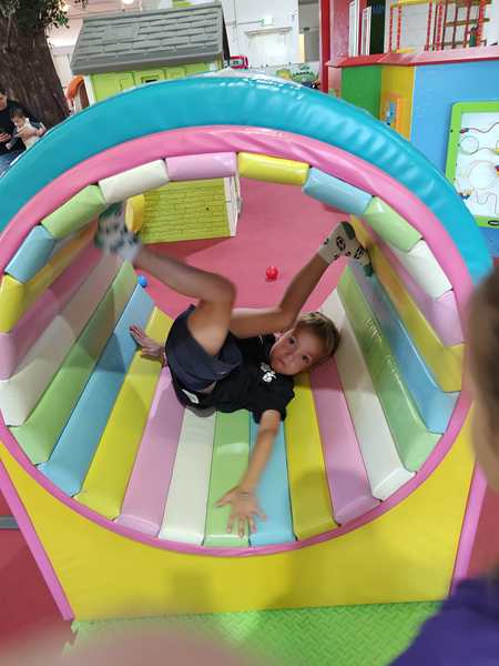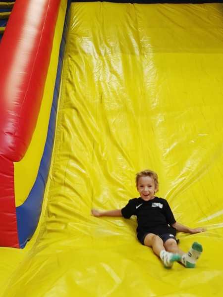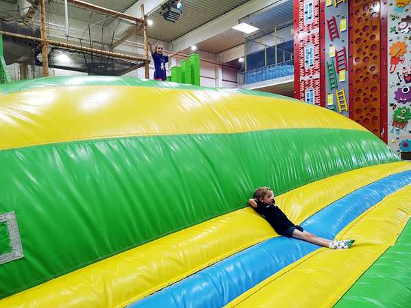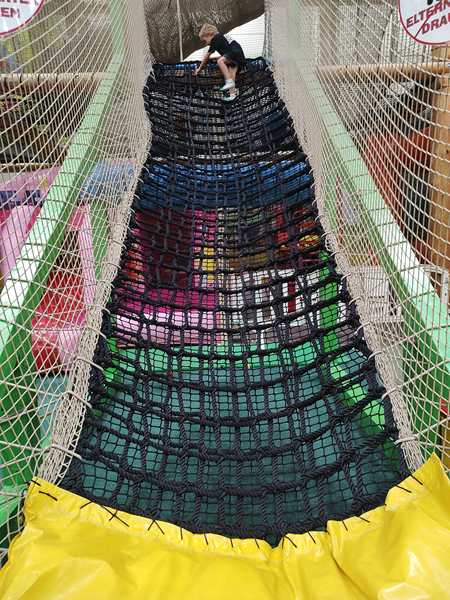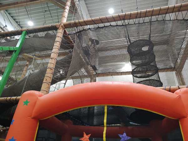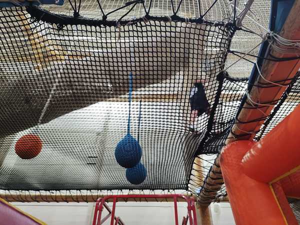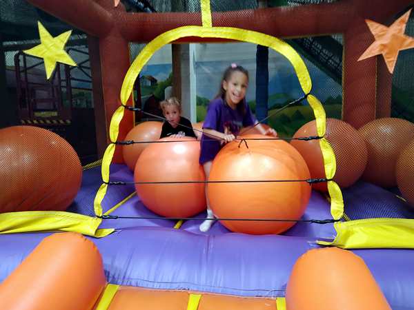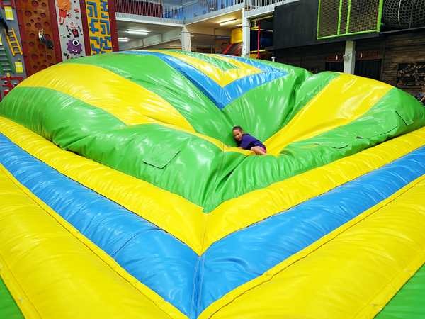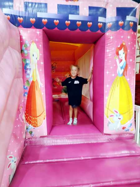 They were jumping around on blow-up castles and the huge blow-up mattress in the middle of the room, and Tammy was especially excited about the high slide in the corner. Emmy was too scared to go down the first time he went up and came down the stairs again. Tammy went up and down quite a few times. Emmy then went up a knew net-climbing thing, but Tammy didn't want to. Then they both went to another climbing construct that had lots of obstacles and slides inside. Tammy wasn't so keen and stayed in one place while Emmy checked it all out.