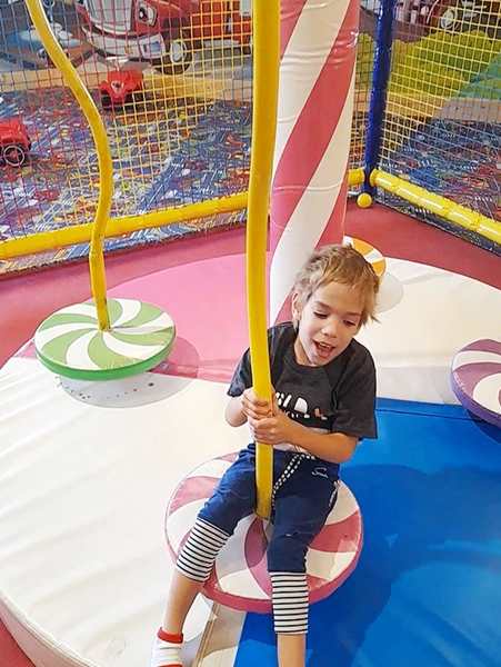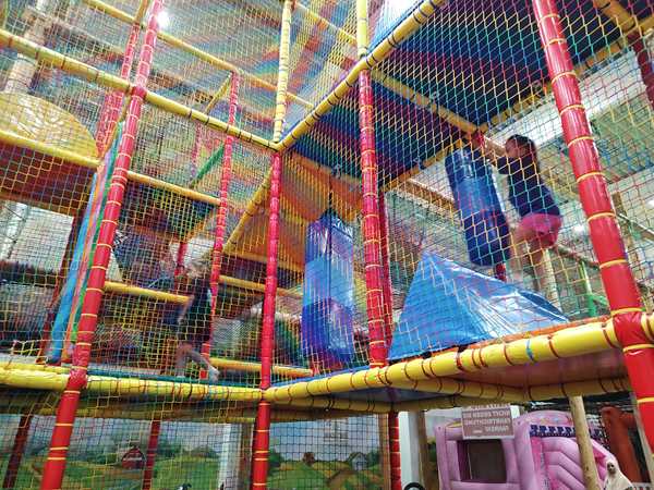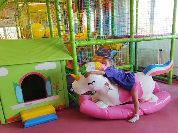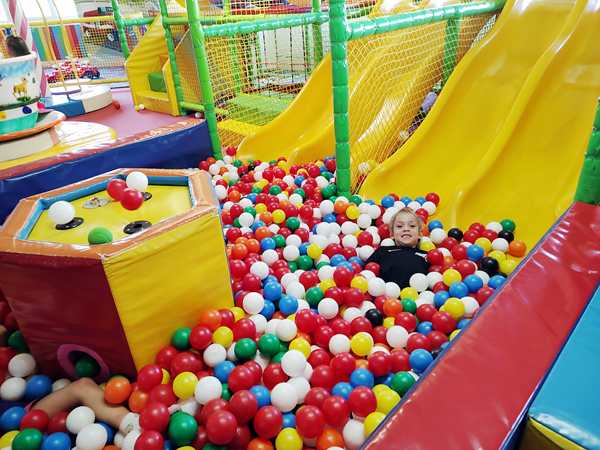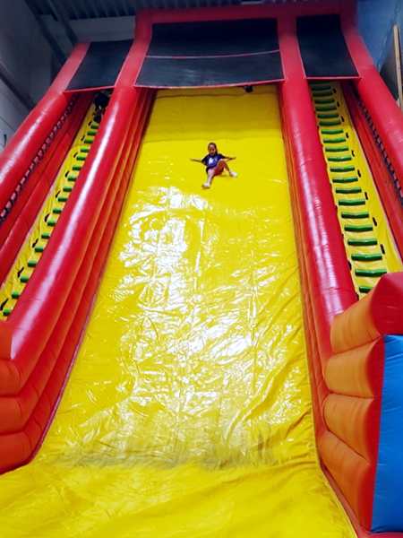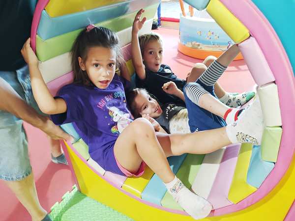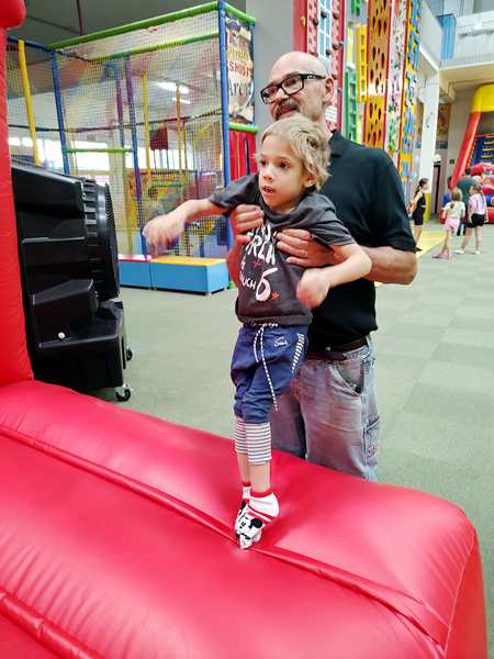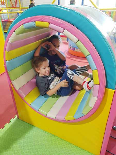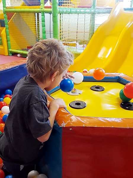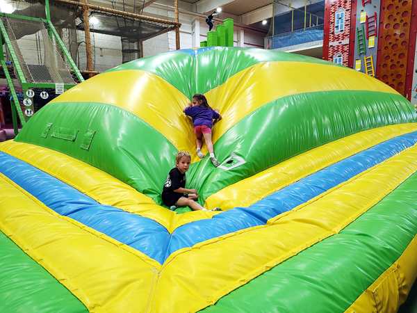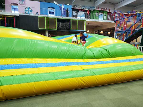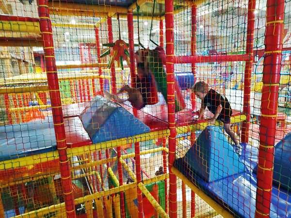 They were jumping around on blow-up castles and the huge blow-up mattress in the middle of the room, and Tammy was especially excited about the high slide in the corner. Emmy was too scared to go down the first time he went up and came down the stairs again. Tammy went up and down quite a few times. Emmy then went up a knew net-climbing thing, but Tammy didn't want to. Then they both went to another climbing construct that had lots of obstacles and slides inside. Tammy wasn't so keen and stayed in one place while Emmy checked it all out.
