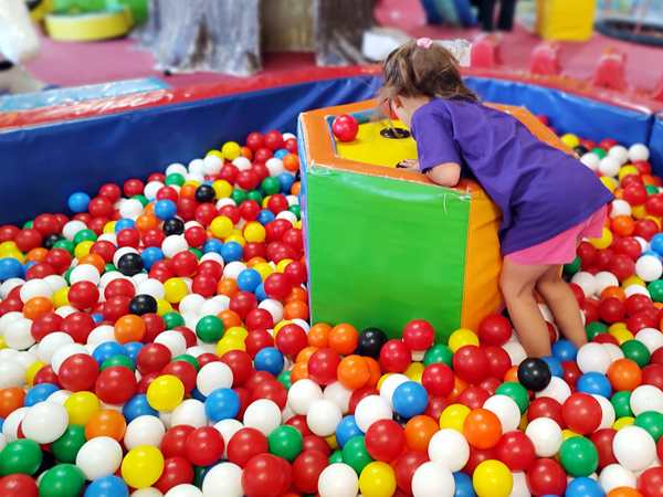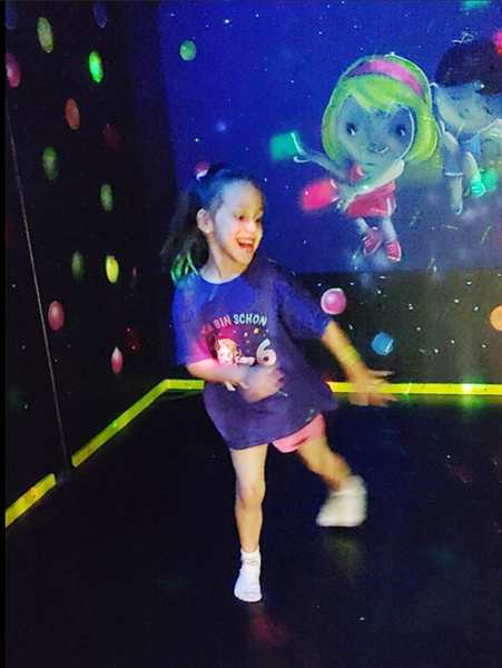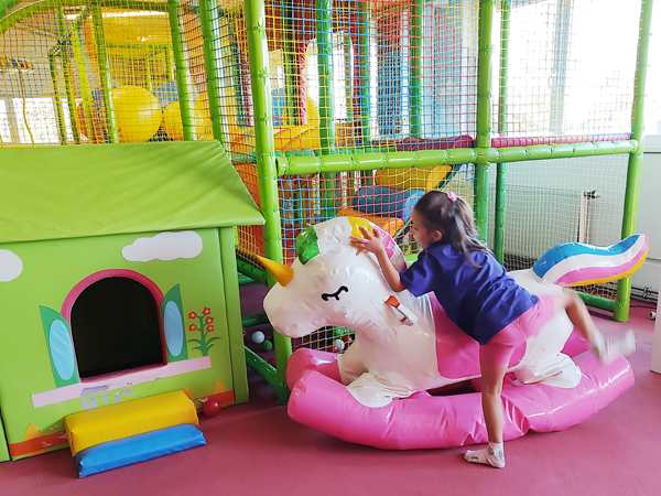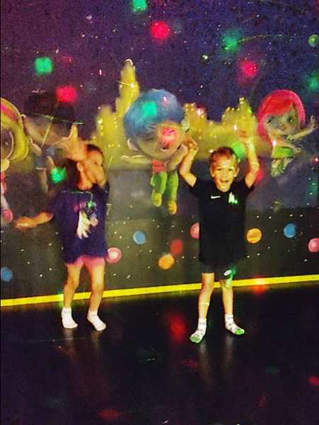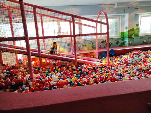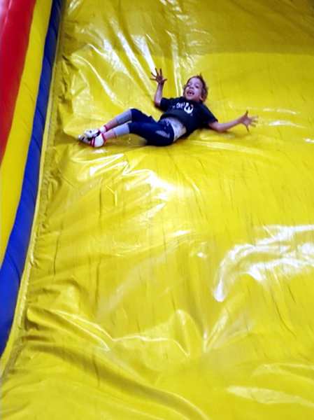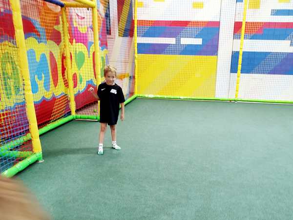 We went back downstairs and found a dark maze with uneven floors. Tammy was too scared to go inside but Emmy did and came sliding down on the other side. There was also a kids' disco in a dark room there where they were dancing and having fun for a few minutes. Then we moved on, and Emmy found the soccer court and started playing with another boy there while Tammy went down the big slide a few more times. Then she tried to go climbing but was told it was closed for the day which was the end for her. From then on it was just crying.