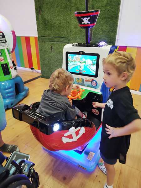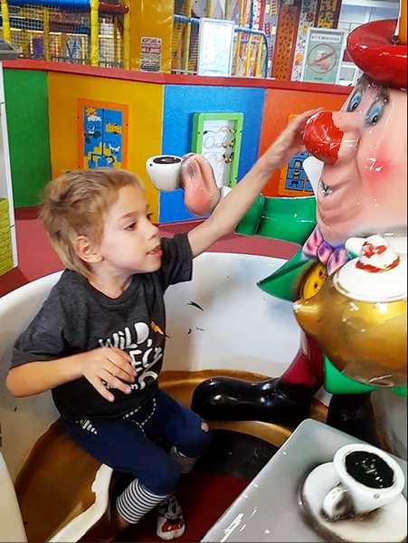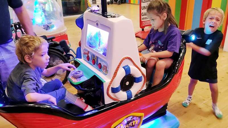 Then we went back to the entrance where they had machines you had to put coins into. Sammy did one, and then they all did another one. Emmy was not happy when Randy added Sammy next to him as he had wanted to ride it by himself.