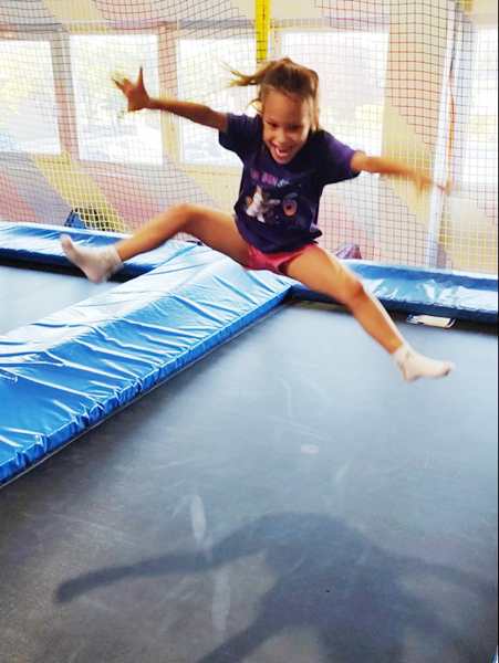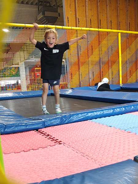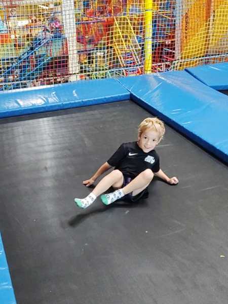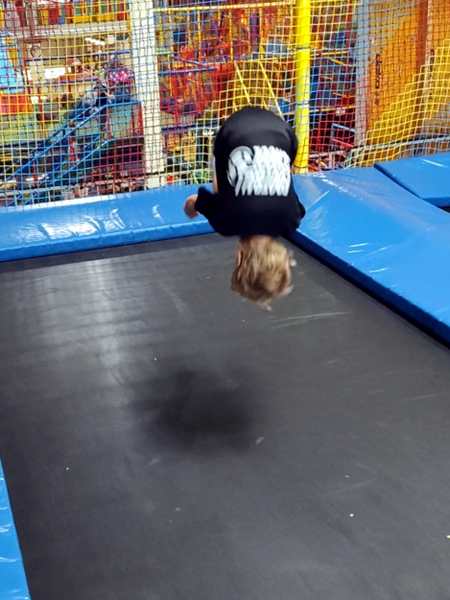 We then took the elevator up to the top where they had the play area for little kids which was perfect for Sammy. Randy stayed with him there, while I went with the other two who did some more climbing and sliding, then we went to the trampolins. Emmy let himself fall on his behind and was then able to stand on his feet with the bounce. And he impressed me in how close he came to doing a somersault. He turned in the air and landed on his behind. It won't take much for him to be able to do it and land on his feet.