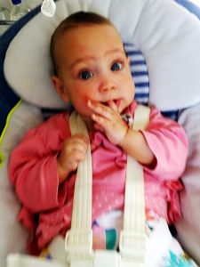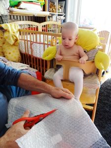 Randy has been using bubble wrap to stuff the high chair and cut it into smaller pieces today. Emmy sure looks scared when he sees those big scissors coming towards him! In any case, it worked well. However, nobody ate that much for lunch today. In the evening, we added pear to the cereal for the first time, instead of apple, and they loved it and ate the whole cup.