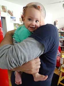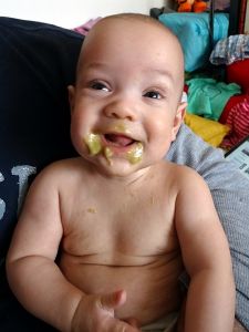 Tonight we changed the cereal from oats to a mixture (Grieß) of dinkel, wheat and oats. They liked it just as much. We're still adding some pear to that. Only Sammy was pretty cranky (yes, his teeth probably), and did not eat it all.
