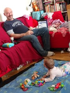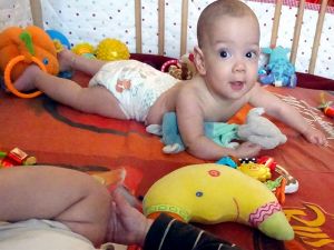 This afternoon, I watched Emmy, and I tried to motivate him to complete a turn from his back to his belly. He went much of the way, but always returned to his back. One of these days!