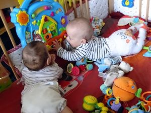 Tonight Randy had to go pick up the last toy - and he's glad; we now have to move all this stuff to another apartment! He mounted one of the new, nice ones with buttons and wheels that makes sounds and music, and the babies loved it.
