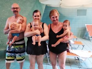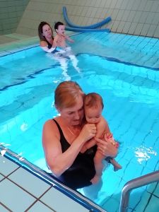 We locked our stuff up and went inside. There was still a baby class going on in the whirlpool, so we had to wait. We met the lady whose daughter was the fourth baby of the group. She took this picture of us. I wished we could have had pictures of all of us while in the water; the teacher said she'll take it some other day. I did take a picture of Grandma and Tamara, right after they went in. Tammy wasn't so sure about all this water! She looked a little skeptical for most of the class (which lasted 30 minutes).