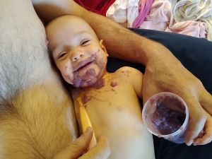 Daddy had Sammy, which was a little more challenging; some stuff was hard for him, and he tends to put his head down, so he was sipping water when his mouth went under. One time he got a little choked. He also got cranky, but thankfully Daddy had his pacifier with him. I think he enjoyed it for the most part.