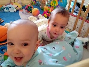 I did sit right next to their bed for a while before/when Randy left (by the way, he came back empty-handed). Emmy was trying hard to get to me, and then I saw him for the first time be on all fours! Tammy has been doing that for a while, but not Emmy. Several times he got on all fours for only a few seconds each, but it's a start! You can actually see it in the video I uploaded.