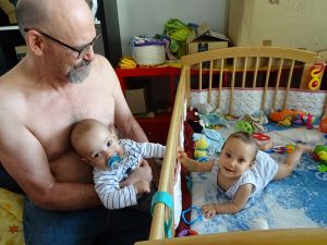 Once again both boys needed milk in the middle of the night. This time it was right after 3 am, so later than usual. It's always tough getting up at that time. Since both boys wanted to be fed at the same time, Randy jumped in to feed one. He went to the living room, right next to where Tammy sleeps, and so she woke up as well. Randy decided to just start the day earlier and clothed them all (which he always does).