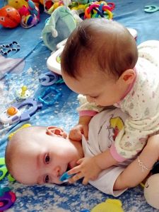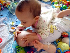 Tammy had a very hard time this afternoon. She was crying so hard, and nothing helped her. Dental creme, food, diaper change... we couldn't figure out what was wrong. She wanted to be held, and so I just held her. I finally lay down in bed with her, and she still screamed for a long time, until she got tired and finally fell asleep in my arm. She didn't sleep long, though, and continued being unhappy after she woke up. It was only after dinner, once she was in her pj's and with Emmy in bed (Sammy was already asleep), that she was finally herself again. She was smiling and laughing with Emmy, and climbing on top of him, which she enjoys doing, as well as taking his pacifier and toys away.