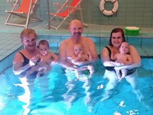 Today was the third time, and we changed up again who has who. I took Sammy today, and Randy Emmy, and Grandma had Tammy again. That was a good decision. Sammy did great with me, did a lot of smiling and even laughing. He had fun! Towards the end the teacher suddenly said that we would dive today. Oh no! I was a little apprehensive about that, and how Sammy would do. They all dove twice, very briefly. The first time Sammy was in shock, but recovered well. The second time he was pretty cool about it. Tammy and Emmy did really well with it. Who would have thought that they'd be diving at this point!