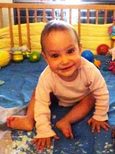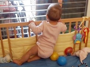 Tammy has had a really active day. She's sitting up quite a bit now, and I got several pictures. This morning, Randy woke up, sleeping next to their bed, and saw Tammy looking over the railing. In the afternoon I saw her do the same thing, twice, and got to film her trying to stand up! And this girl's biological age is only 7.5 months!!! It's time to lower the mattress! Even though that will make it hard for me to reach them in there.